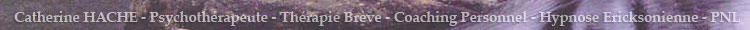 Catherine HACHE Psychologue et Psychothérapeute Thérapie Brève, Coaching Personnel, Hypnose Ericksonienne, PNL Consultations en semaine, de 9h30 à 18h, uniquement sur rendez-vous : Téléconsultation via Whatsapp Master 2 en Psychologie Clinique (IED Paris 8)/ Maître praticien en Thérapie Brève, Hypnose et PNL